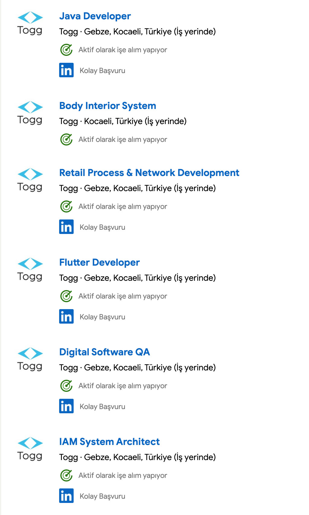 Yerli otomobil projesinin arkasında yer alan Togg, birçok farklı alanda ve bölgede işe alımlar yapmayı aktif olarak sürdürüyor.