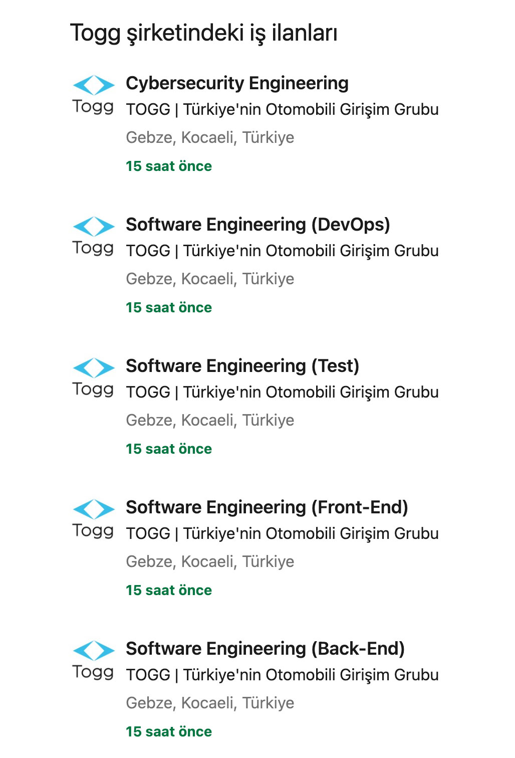Özet geçmek adına ilk Togg imzalı yerli otomobil modeli SUV formunda olacak ve kurulumu süren Gebze merkezli fabrikada 2022 sonunda üretime alınacak. Çok merak edilen resmi satış fiyatı halen resmi olarak açıklanmayan tamamen elektrikli otomobilin, 2023’ün ilk yarısında yollara çıkarılması hedefleniyor. İşte bu aracın ve projenin geliştirme sürecinde birçok farklı personele ihtiyaç bulunuyor. Şu an Togg’un buradan ulaşabileceğiniz LinkedIn sayfasında yeni eklenen aşağıdaki ilanlar ile beraber 45 farklı iş ilanı bulunuyor. İş ilanlarını sürekli olarak artıran veya kapanan seçenekler ile beraber sürekli güncelleyen Togg, bu sefer dört farklı yazılım odaklı çalışayacak bilgisayar mühendisi arıyor. Aynı zamanda bir Siber Güvenlik Mühendisi de aranan kişiler arasında yer alıyor. Bu aşağıda görebileceğiniz ilanların hepsi Gebze / Kocaeli merkezli olarak açılmış durumda.
