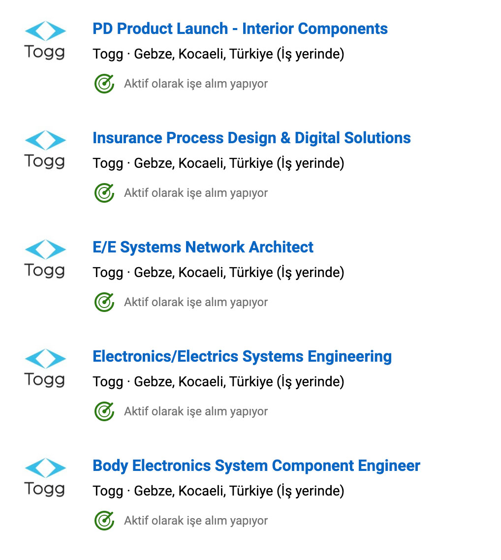 Yerli otomobil projesinin arkasında yer alan Togg, birçok farklı alanda ve bölgede işe alımlar yapmayı aktif olarak sürdürüyor.