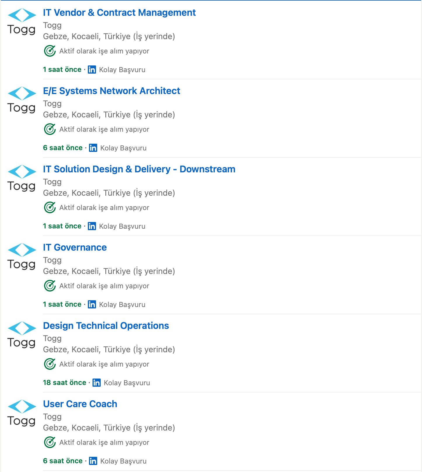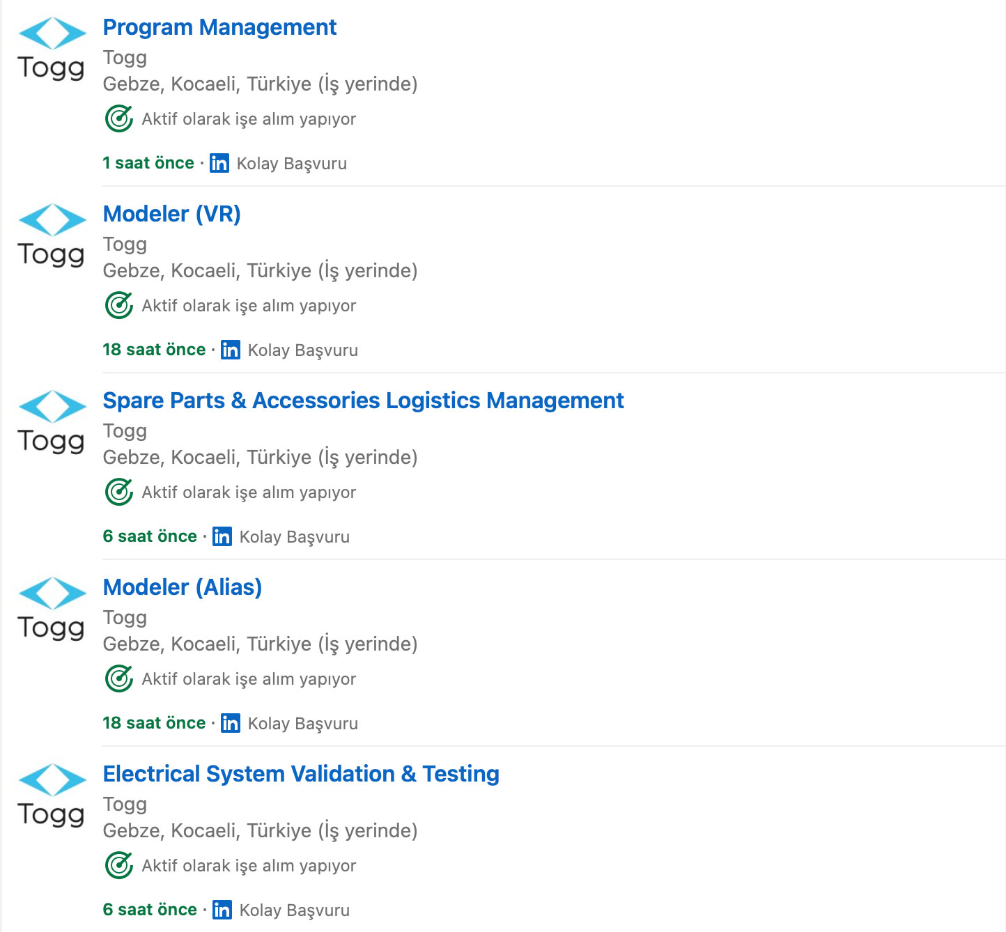 Yerli otomobil projesinin arkasında yer alan Togg, birçok farklı alanda ve bölgede işe alımlar yapmayı aktif olarak sürdürüyor.