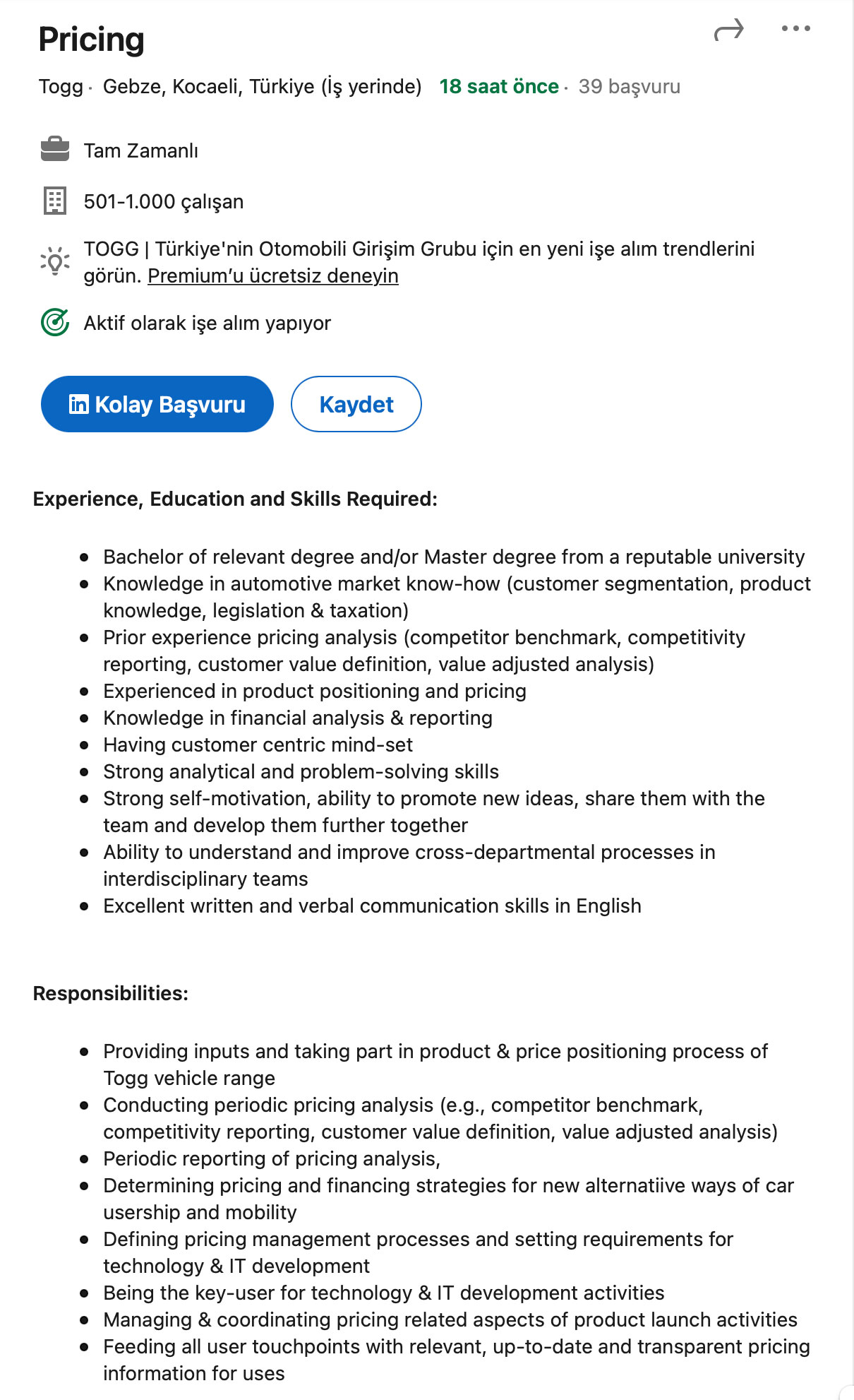 Togg imzalı ilk yerli otomobil modeli SUV formunda olacak ve planlara göre kurulumu süren Gebze merkezli fabrikada 2022 sonunda üretime alınacak. 2023’ün ilk yarısında yollara çıkarılması hedeflenen araç için işe alımlar sürüyor ve şu an Togg’un buradan ulaşabileceğiniz LinkedIn sayfasında 29 farklı iş ilanı bulunuyor. İş ilanlarını sürekli olarak artıran veya kapanan seçenekler ile beraber sürekli güncelleyen Togg, kısa süre önce önemli bir iş ilanı daha açtı. Direkt olarak burada yer alan yeni iş ilanında Togg’un üretim ve araç ürün gamındaki “fiyatlandırma” sürecinde görev alacak tecrübeli bir kişi aranıyor. Bu kişiden, rakipler göz önüne alınarak yürüyecek fiyat belirleme sürecini aktif olarak üstlenmesi yanında, araç alımı için alternatif ödeme ve sahiplik sistemleri geliştirmesi de bekleniyor.
