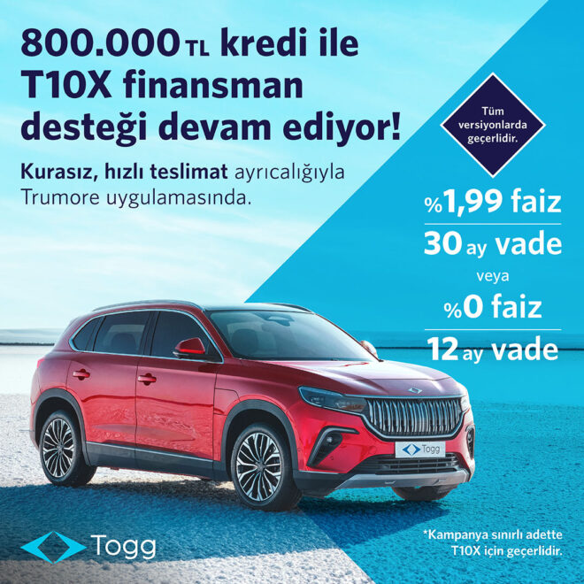 Bu konuda şunlar aktarıldı: “Türkiye’nin mobilite alanında hizmet veren küresel teknoloji markası Togg, T10X’i farklı finansman avantajlarıyla kullanıcılarla buluşturmaya devam ediyor. Togg, nisan ayında en donanımlı versiyon olan T10X V2 uzun menzil için başlattığı kampanyayı genişleterek sürdürüyor. Bu kapsamda T10X V2 uzun menzilin yanı sıra T10X V1 uzun menzil ve V1 standart menzil de anlaşmalı bankalarda 800 bin TL krediye %0 faiz ve 12 ay vade ödeme seçeneğiyle kullanıcılarla buluşacak. Sınırlı sayıda T10X için geçerli olacak kampanyada dileyen kullanıcılar, 800 bin TL krediye %1,99 faiz oranıyla 30 ay vade seçeneğiyle de T10X sahibi olabilecek. T10X, yakın zamanda uzaktan (OTA- Over The Air) yüklenen yeni yazılımı 1.4.0 ile akıllı özelliklerine yenilerini ekledi. T10X kullanıcıları yeni güncelleme ile sınıfının en büyük uçtan uca bilgi eğlence ekranındaki uygulamaları artık tam ekran ve farklı renk temalarıyla kullanabiliyor. Kullanıcılar T10X’te oturum açarken manuel olarak pin girmek yerine yüz tanıma yöntemiyle oturum açabiliyor. Aynı T10X’i kullanan farklı kullanıcılar için profil bazlı kişiselleştirme hafızası da devrede.