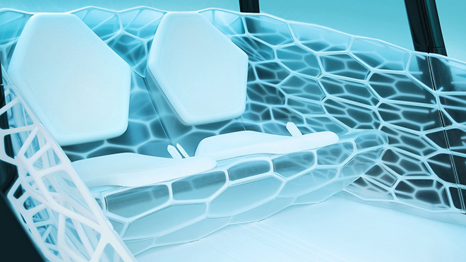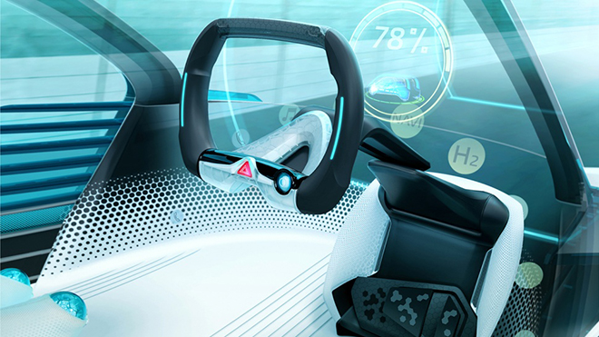 Dışarıdan solaryum cihazı gibi görünen yapının içine girdiğimizde epey sade bir tasarımla karşılaşıyoruz. Hem sürücüye hem yolcuya geniş görüş açıları sunan cam tasarımının yanında sürücünün işine yarayacak bilgilerin head up display biçiminde ön cama yansıtılması sadeliği sağlayan detaylardan.
