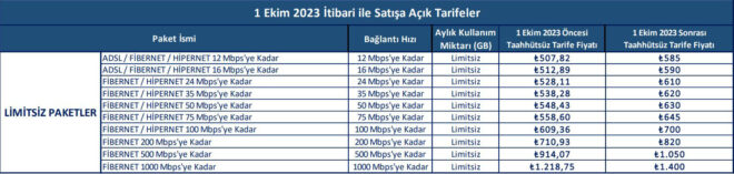 1 Ekim itibarıyla Türk Telekom tarafından devreye alınacak yeni yeni taahhütsüz internet fiyatları, 12 Mbps’ye kadar “limitsiz” tarife özelinde tam 585 TL‘den başlayacak. Burada 507 TL‘den 585 TL’ye çıkış yapacak olan firma, kişilerden 1 Ekim sonrasında en üstteki 1.000 Mbps “limitsiz” tarife özelinde 1.218 TL değil 1.400 TL isteyecek. Birçok kişi için en ideal olan 50 Mbps hız sunulan “limitsiz” tarife içinse 1 Ekim sonrasında taahhütsüz fiyat 548 TL’den tam 630 TL’ye çıkacak. Bu fiyatlar elbette taahhütsüz paketler için paylaşılıyor, uzun vadeli taahhüt yapıldığı zaman kullanıcılar daha uygun fiyatlar elde edebiliyor. Türk Telekom tarafından yapılan fiyat artışları maalesef şirketin altyapısını kullanan diğer firmaların fiyatlarını da etkiliyor, Türkiye’de yüksek hızlı internet erişimi her geçen daha pahalı olmaya devam ediyor.