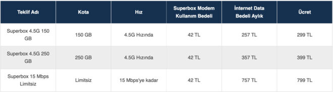 Bu fiyatlar yüksek geldiyse bir de Turkcell Superbox için sunulan, 12 aylık kontrat bitimi sonrası uygulanan taahhütsüz kullanım paketlerine bir göz atın. Bu paketler için firma tarafından açıklanan inanılmaz güncel fiyatlar şöyle: