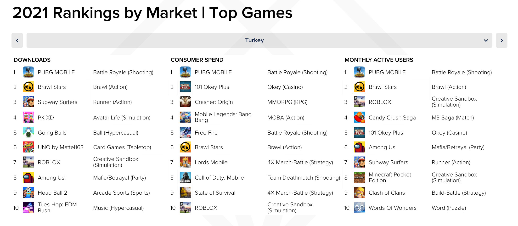Türkiye’de 2021 toplamında en çok indirilen mobil oyun PUBG Mobile oldu. İkinci sırada Brawl Stars, üçüncü sırada ise Subways Surfers yer aldı. Kişiler Türkiye’de 2021 toplamında en çok PUBG Mobile, 101 Okey Plus ve Crasher: Origin oyunlarında para harcadı. 2021’de en çok aktif kullanıcıya sahip oyunlar ise PUBG Mobile, Brawl Stars ve ROBLOX oldu.