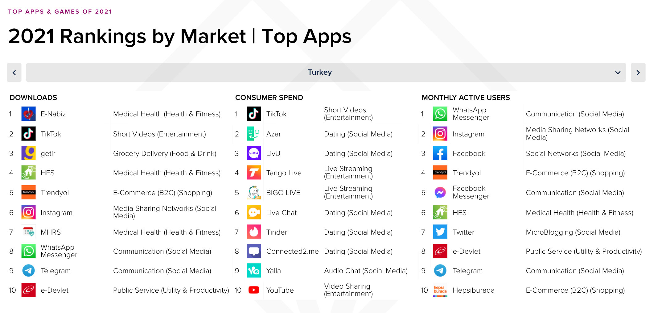 Peki 2021’de en çok hangi oyun ve uygulamalar indirildi? Rapora göre Türkiye’de 2021 toplamında en çok indirilen mobil uygulama pandeminin süren etkisiyle E-Nabız oldu. İkinci sırada TikTok, üçüncü sırada ise Getir yer aldı. Kişiler Türkiye’de 2021 toplamında en çok TikTok, Azar ve LivU uygulamalarında para harcadı, 2021’de en çok aktif kullanıcıya sahip uygulamalar ise WhatsApp, Instagram ve Facebook oldu.
