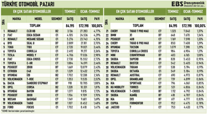 Emre Özpeynirci tarafından burada yapılan paylaşıma göre Türkiye’de geride bıraktığımız 7 ayda en çok satılan sıfır otomobil modeli, toplam 27.283 adetlik satışa ulaşan kompakt model Renault Clio oldu. İkinci sırada toplam 24.536 adetlik satışa ulaşan Fiat Egea Sedan, üçüncü sırada ise toplam 23.743 adetlik satış yapılan Renault Megane Sedan yer alıyor. 7 ay sonrasında en çok satılan ilk 10 sıfır otomobil modeli şunlar: