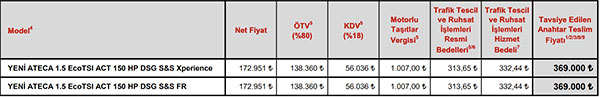 Örneğin SEAT’ın 1.5 EcoTSI motorlu 2020 ATECA modelinin haberimiz yazdığımız tarihte net satış fiyatı güncel kur üzerinden 172 bin TL. Bu araçtan yasal limitler nedeniyle yüzde 80 özel tüketim vergisi alınıyor. Aracın fiyatı daha en başta 138 bin TL’lik ÖTV’yle beraber 310 bin TL‘ye yükseliyor. Buna ÖTV’nin üzerine eklenen yüzde 18 KDV yani 56 bin TL daha geliyor. Diğer yasal ücretler ve MTV ile beraber aracın tavsiye edilen anahtar teslim satış fiyatı tam 369 bin TL‘ye yükseliyor. Bu araçtan ÖTV alınmasaydı satış fiyatı yüzde 18 KDV üzerinden yaklaşık 204 bin TL olacaktı.