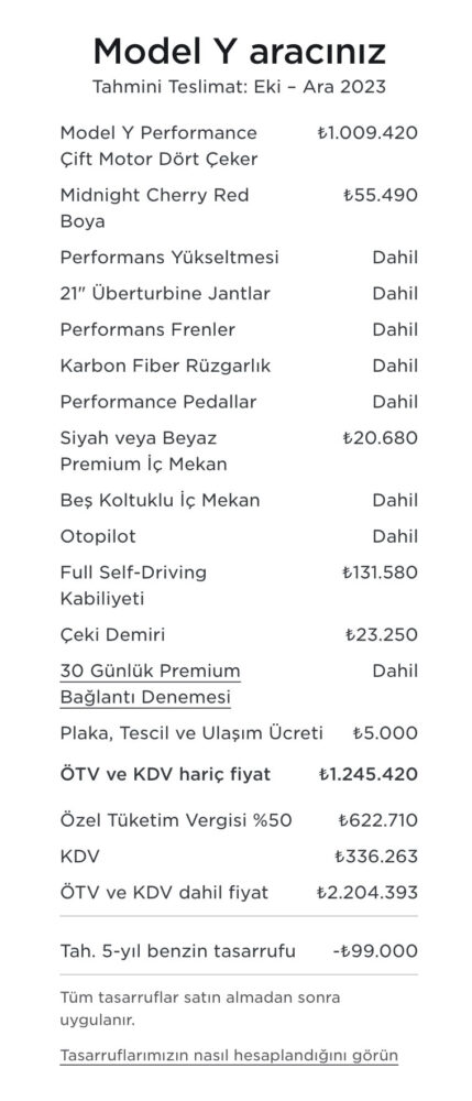 Türkiye’deki en pahalı Tesla Model Y, tam 2,2 milyon TL seviyesinde. Bu fiyatın içerisinde 622 bin TL ÖTV ve 336 bin TL KDV yer alıyor.