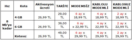 TurkNet, Hızlı İnternet Kampanyası’ndan yararlanmak isteyen, ancak başka bir tarifenin dahilinde olan kullanıcılarını da düşünerek, kullanıcıların istedikleri takdirde Hızlı İnternet Kampanyası’nın sunduğu 8 Mb/sn hızından yararlanabilmelerini de sağlıyor. 31 Mayıs 2009 tarihine kadar geçerli olan ve yalnızca stoklarla sınırlı olan Hızlı İnternet Kampanyası’nın tarifeleri ise şöyle: