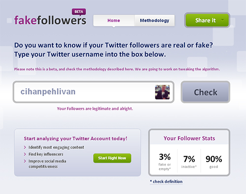 Sosyal ağlara yönelik optimizasyon ve analiz araçlarıyla bilenen site, hayata aldığı platformla birlikte kişilerin mikro blog’daki takipçilerinin gerçeklik oranlarını çıkarmalarına yardımcı oluyor. “Fake Followers Check” ismindeki hizmet profillerin spam kapsamına giren kelimeleri tekrarlanma oranı, üçten fazla gönderilmiş eş tweet’ler, takipçi ve tweet sayısı gibi parametleri göz önünde bulundurarak rapor hazırlıyor. Sonuç olarak yüzdelik dilim şeklinde takipçilerinizin durumu yansıtılıyor.