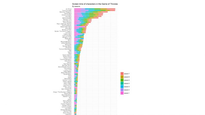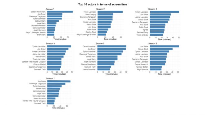 Ekran sürelerine baktığımızda Jon Snow ve Tyrion Lannister’ın ilk iki sırada yer aldığını görüyoruz. Hikaye örgüsünde oldukça önemli yerlere sahip bu karakterleri ise üçüncü sırada Daenerys Targaryen takip ediyor. Listedeki en ilginç detay ise birinci sezonda veda ettiğimiz Ned Stark‘ın onsuz geçen 6 koca sezondan sonra ilk 15 içinde hala kendine yer bulabiliyor olması.