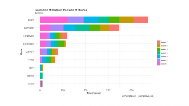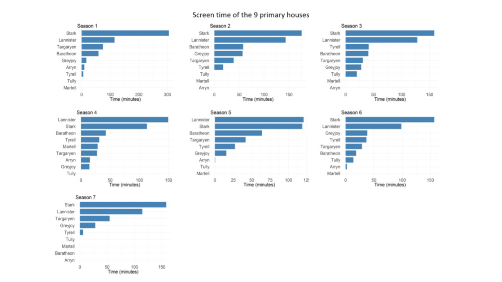 Sezon bazlı incelendiğinde de Jon Snow ve Tyrion Lannister’ın baskısı görülüyor. 2, 3 ve 4. sezon Tyrion Lannister önderliğinde giderken; 6. ve 7. sezonda Jon Snow lider koltuğuna oturuyor. Ailelere baktığımızda ise Stark ailesinin tartışmasız liderliğini görüyoruz. Başlarına gelmeyen kalmayan Stark ailesi hem genel hem de sezon bazlı incelendiğinde kesinlikle dizinin “ana” ailesi olduğunu kanıtlıyor. Öte yandan serinin isminin Buz ve Ateşin Şarkısı olmasına rağmen Targaryen ailesi pek bir zayıf kalmış durumda. İkincilik ise elbette Lannister ailesinin.