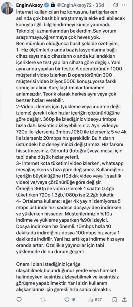 Vodafone Türkiye CEO’su Engin Aksoy, aktif olarak kullandığı X hesabından bu sefer internet hızlarına yönelik bir açıklamada bulundu. “İnternet kullanıcıları hız konusunu tartışırlarken aslında çok basit bir araştırmayla elde edilebilecek konuyla ilgili bilgilendirmeyi kimse yapmadı. Teknoloji uzmanlarından beklerdim. Sanıyorum araştırmaya, öğrenmeye çok heves yok. Ben mümkün olduğunca basit şekilde özetliyim.” diyen Aksoy, paylaşımında şunları aktardı: