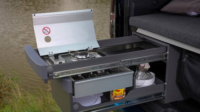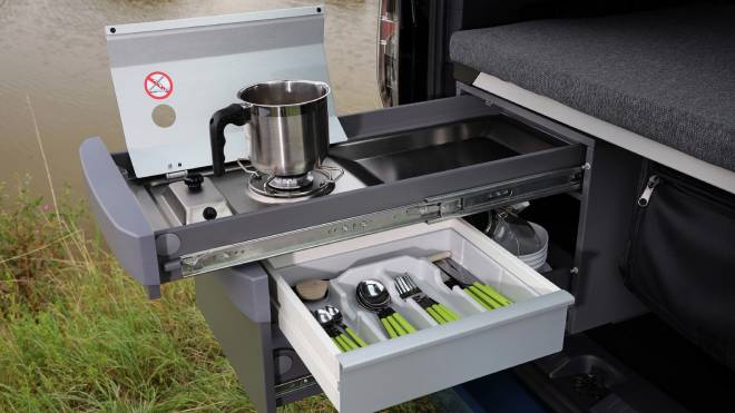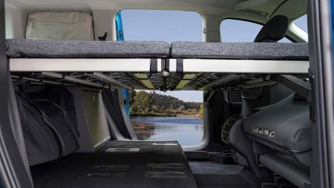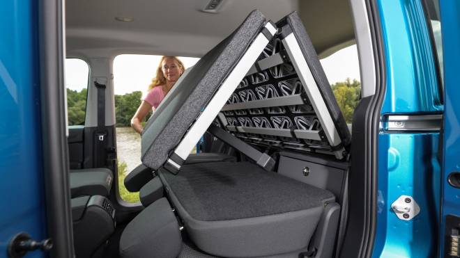 California versiyonu dışarıdan bakıldığında standart bir Caddy gibi görünüyor. Nitekim aracın dinamiklerini anlamak için kapılarını ve bagaj kapağını açmak yeterli. Bunu yaptığımızda ilk olarak karşımıza konfor dinamikleri yüksek yeni bir katlanabilir yatak çıkıyor. Yay sistemi modernize edilen yatak, kullanılmadığı süreçte bagajda yer alan bölümde konumlandırılıyor. Bununla birlikte kullanıcılar için iki adet sandalye, bir kamp masası ve mini bir ocak için bir alan da yine genel yapı içerisinde karşımıza çıkıyor. Mini bir mutfak olarak nitelendirebileceğimiz bölümde ocakla birlikte bir çatal bıçak tepsisinin yanı sıra pişirme kapları ve erzak için saklama alanı bulunuyor.