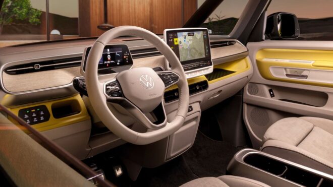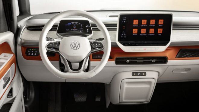 Aracı ailenin diğer üyelerinden ayıran en büyük özelliklerinden birisi ise otonom sürüş teknolojisi tarafında. Volkswagen’in sürücüsüz araçlar için test yatağı olarak kullandığı Buzz, bu vesileyle son nesil aktif ve pasif sürüş destekleriyle geliyor. Bunlar arasında ön bölge çarpışma asistanı, aktif şerit takip asistanı, yaya algılama, adaptif hız sabitleyici, otonom acil fren desteği gibi parçalar ön plana çıkıyor. Sürücünün yolculuk sırasında en fazla muhattap olacağı kokpit elemanları, ID.3’den geliyor. Burada 5,3 inçlik dijital gösterge paneli ve 10 inçlik multimedya ekran (opsiyonel olarak 12 inç) karşımıza çıkarken, direksiyon ve diğer yaşam alanında kullanılan döşeme malzemelerinin geri dönüştürülmüş kaynaklardan elde edilmiş olması da altı çizilmesi gereken noktalar arasında.