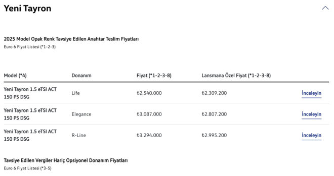 Aracın 1.5 eTSI ACT 150 PS DSG Life sürümü için 2 milyon 309 bin TL, 1.5 eTSI ACT 150 PS DSG Elegance sürümü için 2 milyon 807 bin TL, en üstteki 1.5 eTSI ACT 150 PS DSG R-Line sürümü içinse 2 milyon 995 bin TL fiyat açıklandı. Volkswagen Tayron’un Türkiye macerası hakkında resmi olarak şunlar aktarıldı: “Çok yönlü bir SUV olarak tasarlanan Yeni Tayron, markanın premium segmentteki temsilcisi Touareg ile kompakt SUV segmentindeki Tiguan modeli arasında konumlandırılıyor. Karakteristik ve güçlü tasarımıyla dikkat çeken Yeni Tayron, yüksek konfor seviyesiyle de sınıfının en iyisi olmaya aday. Yedi kişiye kadar oturma kapasitesi, yedi koltuklu versiyonda 850 litrelik ve beş koltuklu versiyonda 885 litrelik ekstra geniş bagaj hacmi, önden veya 4MOTION dört tekerlekten çekiş seçenekleri ve üst düzey güvenlik özellikleri sayesinde büyük aileler için uygun olan Yeni Tayron, aynı zamanda konforlu yapısıyla modern iş dünyasının ihtiyaçlarına yönelik bir model olarak da öne çıkıyor.