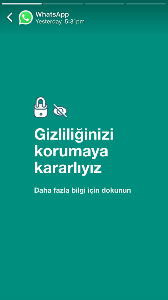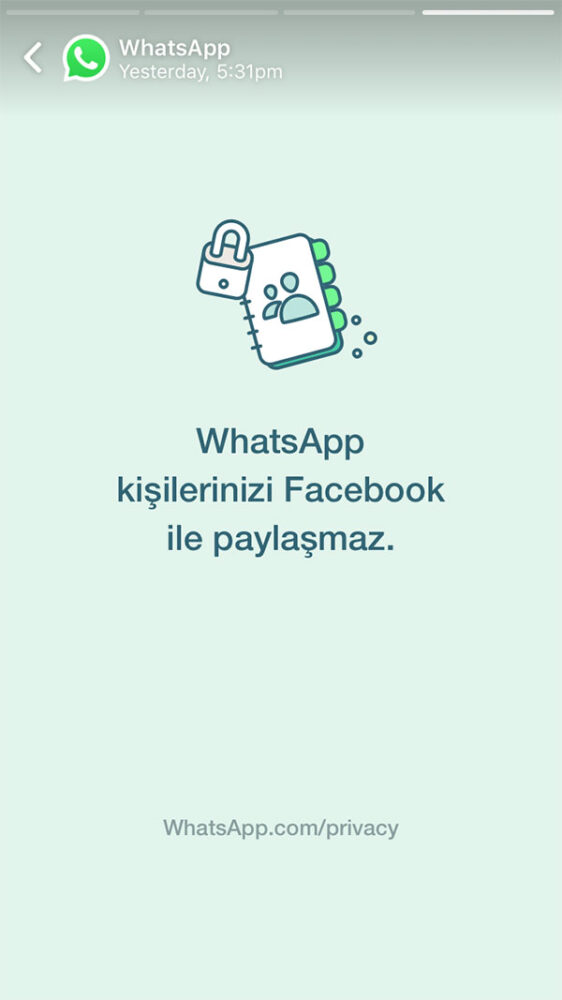 WhatsApp bu sabah ise Türkiye’deki kullanıcılarının uygulama ekranlarında özel bir duyuru yayımladı ve Hizmet Politikası ve Gizlilik Kuralları ile ilgili doğruları tekrar hatırlattı. Şirket ayrıca şu açıklamayı da yaptı: “Gizlilik Politikamız hakkında paylaştığımız son güncellemeden bu yana Türkiye’deki kullanıcılarımızdan birçok soru aldık ve bu soruları yanıtlamak istiyoruz. Bu sabah itibariyle Türkiye’deki kullanıcılarımıza, WhatsApp’ın ve Facebook’un mesajlarınızı göremediğini tekrar teyit eden özel bir durum mesajı göndermeye başlıyoruz.” Firma tarafından gönderilen mesajlar tam olarak şunlardı: