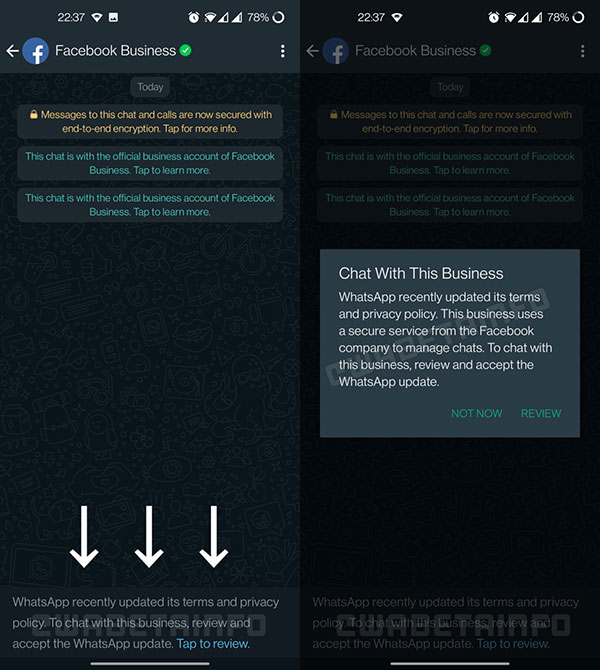Ancak Wabetainfo tarafından bulduğu kadarıyla WhatsApp, içerisindeki onaylı şirketler ile olan iletişimde yeni gizlilik politikasını kabul etmeyi zorunlu hale getirdi.