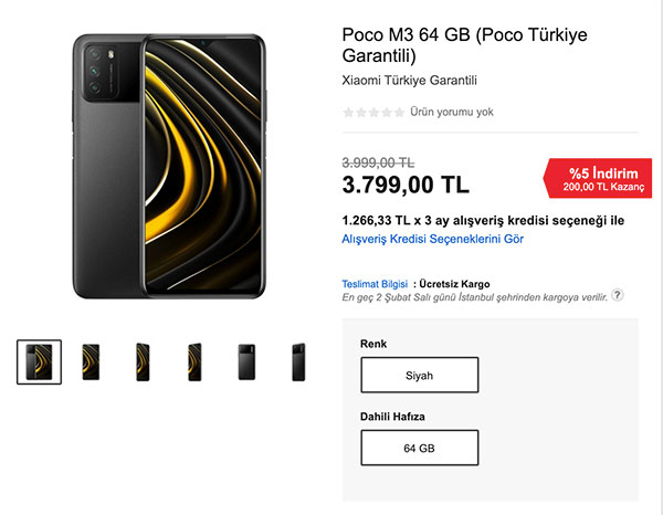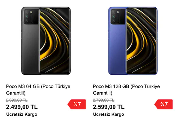 Xiaomi imzalı POCO M3, geçtiğimiz günlerde aşağıda da görebileceğiniz üzere resmi olarak 3.799 TL seviyesinde satışa sunulmuş ancak daha sonra satıştan kaldırılmıştı. Model şimdi bir kez daha resmi garantili olarak satışa çıktı ve erken satış fırsatıyla beraber daha ucuza geldi. Şu an M3 modeli yine aşağıda görebileceğiniz üzere sadece 25, 26 ve 27 Ocak’a özel olarak 64 GB için 2.499 TL, 128 GB içinse 2.599 TL’ye elde edilebiliyor. Yukarıda gördüğünüz üç rengi de Türkiye’ye gelen model, bu fiyat etiketiyle çok geniş bir kitleye hitap ediyor. Fiyatların daha sonra 2.699 Tl ve 2.799 TL’ye çıkacağı belirtiliyor.
