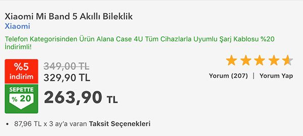 Global pazara geçtiğimiz aylarda Mi Smart Band 5 olarak getirilen Xiaomi Mi Band 5 akıllı bileklik modeli, Türkiye’de normalde 369 TL‘den satışa çıkmıştı. Dikkat çeken bu modeli şu an büyük bir satış sitesinde 263 TL‘ye almak mümkün durumda. 300 TL altında düşüşe devam eden akıllı bileklik, görünüşü bakılırsa önümüzdeki dönemde daha da ucuzlayacak. Fiyatı bu gidişle 250 TL altını 1-2 hafta içerisinde görecek bileklik, biliyorsunuz yerini aldığı Mi Band 4’e oranla devrimsel yenilikler getirmiyor ancak yine de Türkiye pazarında öne çıkmayı ciddi şekilde başarıyor. Mi Band 4’e şu an Türkiye’de 180 TL seviyesinde ulaşmak mümkün.