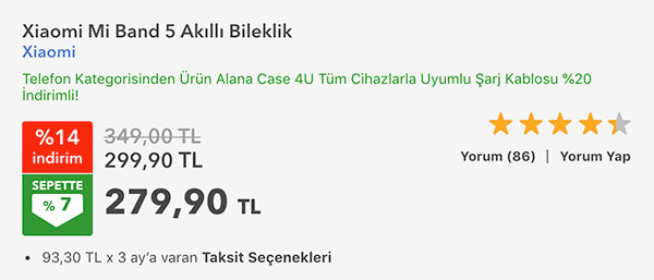 Global pazara geçtiğimiz haftalarda Mi Smart Band 5 adı altında duyurulan Xiaomi Mi Band 5 akıllı bileklik modeli, hatırlarsınız Türkiye’de ilk defa 369 TL‘den satışa çıkmıştı. İşte bu modeli şu an başka büyük bir satış sitesinde ise 279 TL‘ye almak mümkün. Daha önce de söylediğimiz gibi 300 TL altında ufak da olsa düşüşe geçen dikkat çekici model, bu açıdan almayı düşünenleri beklemeye itecek gibi görünüyor. Fiyatın 250 TL altını hemen görmesi beklenmiyor ancak düşüş de sürüyor. Yerini aldığı modele oranla devrimsel yenilikler getirmeyen akıllı bileklik, yine de Türkiye pazarında öne çıkmayı başarıyor.