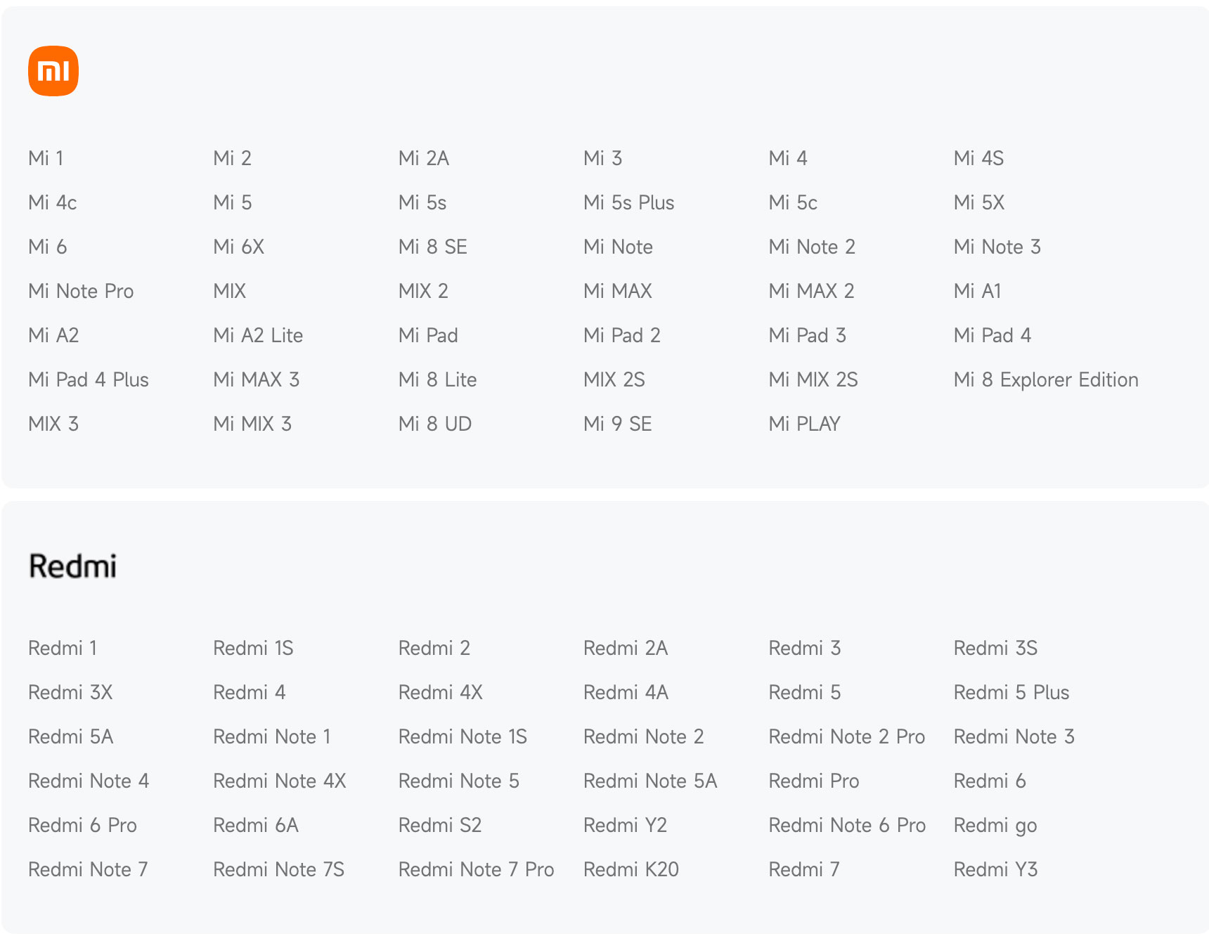 Xiaomi: “MI 1, MI 2, MI 2A, MI 3, MI 4, MI 4S, MI 4c, MI 5, MI 5s, MI 5s Plus, MI 5c, MI 5X, MI 6, MI 6X, MI 8 SE, MI Note, MI Note 2, MI Note 3, MI Note Pro, MIX MIX 2, MI MAX, MI MAX 2, MI A1, MI A2, MI A2 Lite, MI Pad, MI Pad 2, MI Pad 3, MI Pad 4, MI Pad 4 Plus, MI MAX 3, MI 8 Lite, MIX 2S, MI MIX 2S, MI 8 Explorer Edition, MIX 3, MI MIX 3, MI 8 UD, MI 9 SE ve Mi Play”