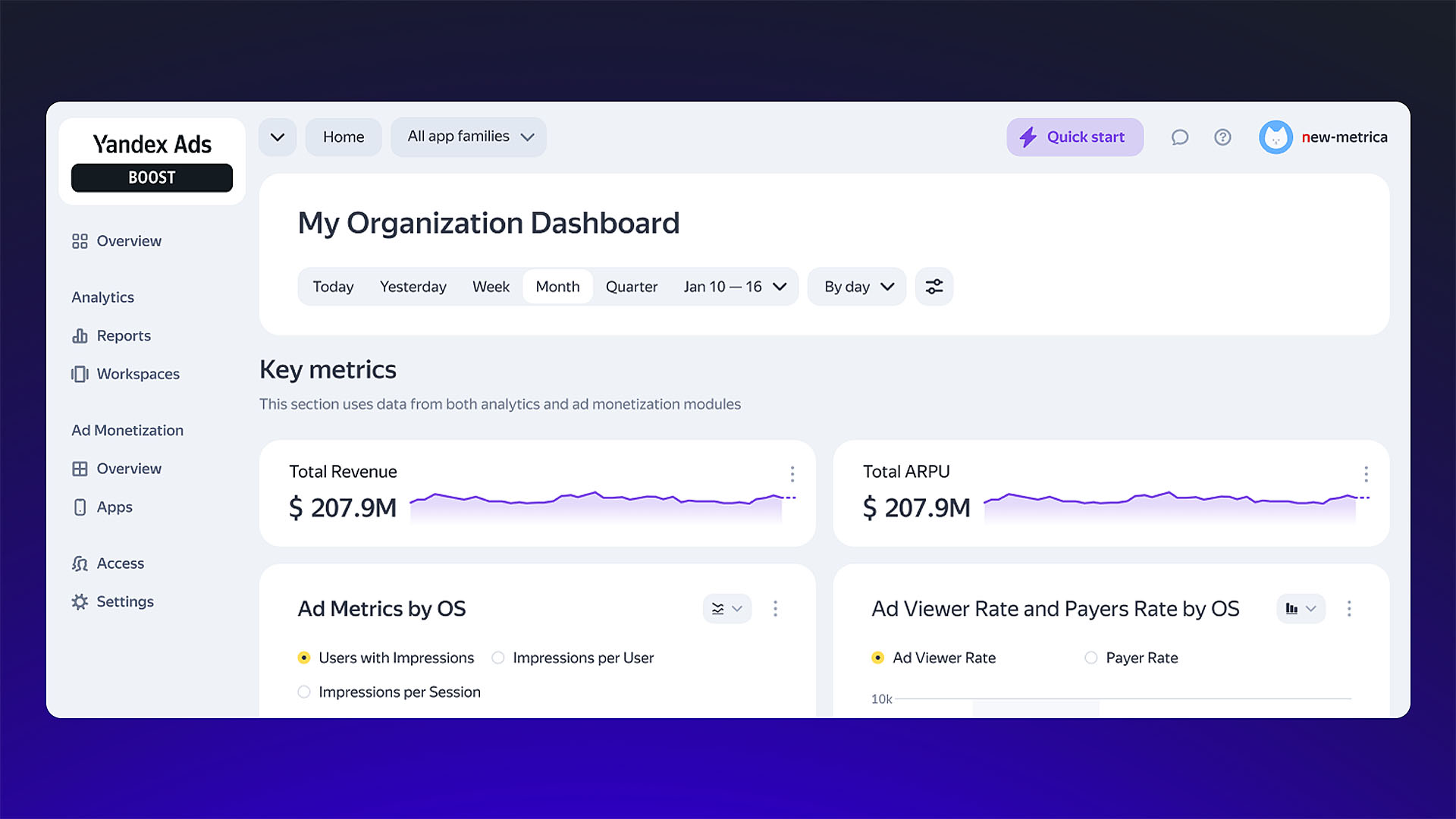 Gelişmiş raporlarda; kullanıcıyı tutma oranı, dönüşüm hunileri, gelir, hedef kitle, dönüşüm oranları, LTV (yaşam boyu değer) ve daha pek çok temel performans metriği kolayca görüntülenebiliyor. Kolay Gelir Elde Etme özelliği, yeni başlayanların bile uygulama içi reklam yerleşimleriyle gelir elde etmeye başlamalarını sağlıyor. Küresel Yandex Reklam Ağı ve üst düzey DSP’ler sayesinde, marka güvenliği ön planda tutularak düzenli gelir elde etmek mümkün oluyor. Yandex Ads Boost uzmanlarından alınan destekle, mobil geliştiriciler reklam yerleşimlerini kullanıcı beklentilerine göre tasarlayabiliyor ve böylece kullanıcı deneyimini artırabiliyorlar. Yandex Ads Boost yakında kullanıcı kazanımı ve uygulama içi satın alma gelirleri için yeni araçlar sunacak ve böylelikle uygulamaların büyüme süreçlerini tek bir kullanıcı dostu platformda uçtan uca destekleyen entegre bir ekosistem haline gelecek.”