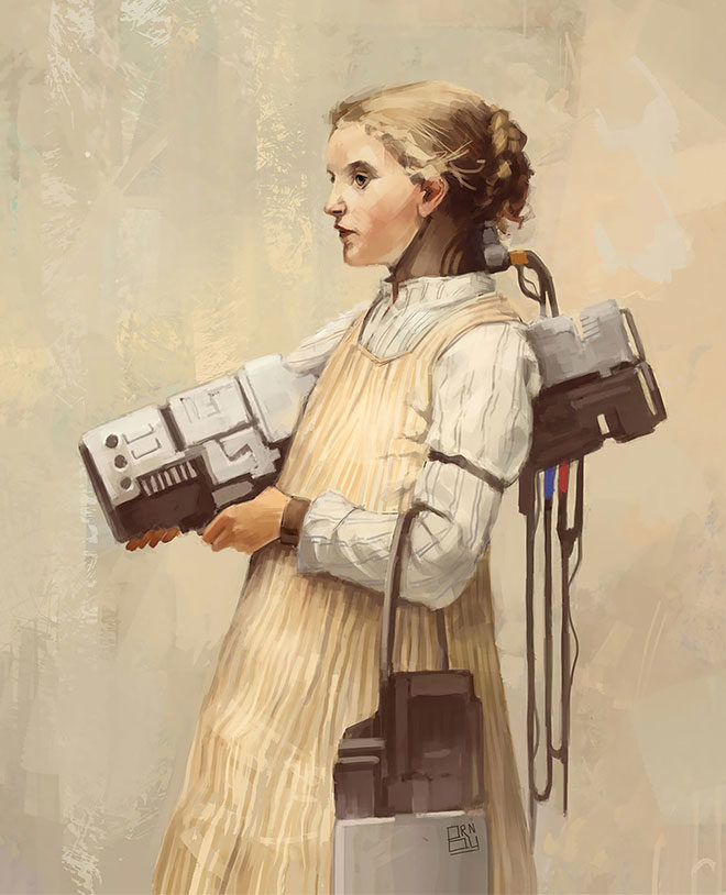 Fotoğrafçılık ve dijital çizimlerin de bu alandan etkilendiğini görüyoruz. Dijital sanatçı Bryn G Jones, Londra’da yaşayan bir yazar ve illüstratör olarak tanınıyor. Hala masa oyunları sektöründe çalışan Jones, aynı zamanda reklam sektöründe ve çizgi roman dünyasında bulunuyor. Kickstarter’da destekçileri için halihazırda portreler çiziyor. Sanatçı eserlerini çoğunlukla Photoshop ve Procreate programlarını kullanarak oluşturuyor. Bryn G Jones’un çizimlerine baktığımızda ise yaratılmış bilim kurgu evrenlerinin dışında, sıradan yaşamla dijital yaşamı birleştirdiğini görüyoruz. Eserlerinde yer alan karakterlerin bazıları yüzyıllar önce çizilmiş yağlı boya tablolarının modernize ve bilim kurgu tohumunun eklenmesiyle şekillenirken, bazılarında Hollywood dünyasından simaları görüyoruz. Ancak Jones, kendisini sınırlandırmayan bir sanatçı olduğu için sıradan, sokaktan insanlara da eserlerinde yer veriyor. Böylelikle kendi bilim kurgu evrenini oluşturarak adeta bir yaşam alanı oluşturuyor.