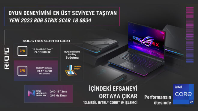 ASUS’un 2023 model ROG Strix SCAR G834 ve G634 oyun dizüstü bilgisayarlarında sunulan en iyi ekran kartları, geliştirilmiş akıllı soğutma çözümleri, en gerçekçi görüntüleri sunan paneller, kişiselleştirilebilen göz alıcı tasarımlarla standartların ötesine geçmeye hazırlanın. ROG Strix SCAR serisinin G634 16 inç ve segmentinde bir ilk olan 18 inç ekranlı G834 modelleri, yeni nesil bileşenler ve akıllı soğutma teknolojileriyle 2023 yılında da ilklere imza atıyor. Segmentine getirdiği birçok ilkle yine adından söz ettiren ROG Strix SCAR serisi, hem espor profesyonellerinin hem de amatör oyun meraklılarının gücüne güç katmaya hazır.