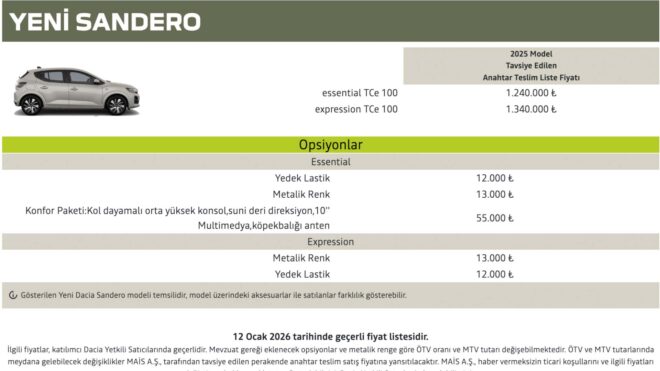 Yeni Dacia Sandero, Türkiye’de satışa sunuldu. Dacia’nın 2026 itibarıyla resmi fiyat listesinde yer alan tek modeli olan yeni Sandero, iki farklı versiyonla sunuluyor. Aracın Essential TCe 100 versiyonu için 1 milyon 240 bin TL, Expression TCe 100 versiyonu içinse 1 milyon 340 bin TL fiyat açıklanıyor. Genel gövde yapısını koruyan yeni Sandero, LED aydınlatma takımlarıyla ve güncellenen tamponlarıyla daha modern hâle getirilmiş. 5,5 litre yakıt tüketim verisi paylaşılan 1.0 litrelik üç silindirli turbo benzinli ünitenin kullanıldığı araç, 100 beygir güç ve 200 Nm tork sunuyor. Altı ileri manuel şanzımanla satılan yeni Sandero, 100 km/s hıza 9,7 saniyede çıkabiliyor ve maksimum hızı 180 km/s olarak açıklanıyor. 10 inç boyutunda dokunmatik ekranın kullanıldığı araç, Android Auto ve Apple CarPlay desteklerini eksik etmiyor.