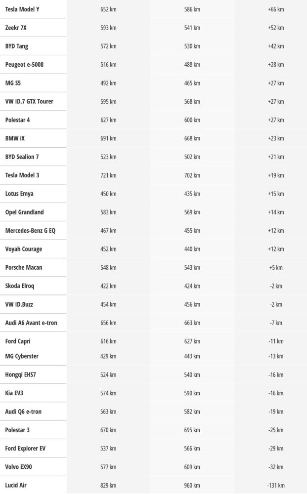 Norveç Otomobil Kulübü (NAF), 2020’den bu yana yılda iki kez üreticilerin elektrikli araçlar için açıkladığı menzil verileri ile gerçek menzil performansı arasındaki farkı test ediyor. Yapılan son teste dahil edilen araçlardan yeni Tesla Model Y (dört çeker uzun menzil), 652 km yol yaparak Tesla’nın resmi olarak paylaştığı 586 km’lik WLTP menzil verisini geride bırakmayı başardı. Norveç’te gerçekleştirilen gerçek kullanımın simüle edildiği testler sırasında hava sıcaklığı 7 ila 17 derece arasında değişiklik göstermiş. Birçok aracın WLTP verisini geride bırakmayı başardı testte Lucid Air, en kötü sonucu gösteren araç olmuş. 960 km WLTP verisine sahip araç, normal şartlarda 829 km yol yapabilmiş. WLTP’yi 131 km kaçırmış olsa da 829 km’lik menzile ulaşması oldukça iyi olan Lucid Air, 118 kWh kapasitesinde büyük bir bataryaya sahip. Teste dahil edilen araçlar arasında Kia EV3 de yer alıyor. EV3, 590 km’lik WLTP verisini küçük bir farkla kaçırarak 574 km yol yapabilmiş. Testin genel lideri WLTP’ye kıyasla 66 km daha fazla yol kat eden Tesla Model Y (dört çeker, uzun menzil) olurken, Peugeot e-5008, BYD Sealion 7 ve Opel Grandland gibi araçlar da WLTP verilerini geçmeyi başarmış.