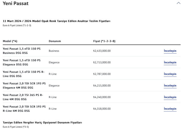 11 Mart 2024 itibarıyla 2 milyon 443 bin TL başlangıç fiyatı olan yeni Volkswagen Passat için ekstra olarak şunlar da paylaşıldı: “Yeni Passat aynı anda birçok farklı ihtiyaç ve beklentiye yanıt veriyor. Artan boyutları, iyileşen iç malzeme kalitesi ve üzerinde yükseldiği yenilikçi MQB Evo platformu ile bir üst sınıfın gereksinimlerini karşılayabilecek bir yapı ortaya koyuyor ve kendi segmentinin sınırlarını aşıyor. Yeni Passat, bir önceki nesline kıyasla tam 144 mm uzayarak, toplam 4.917 mm uzunluğa ulaşıyor. Böylece şimdiye kadarki en görkemli Passat olarak karşımıza çıkıyor. Günümüz şartlarında dahi cömert bir iç hacme sahip olan önceki nesliyle karşılaştırıldığında arkada 50 mm daha fazla diz mesafesi sunuyor. Ayrıca önceki nesline kıyasla 40 litre daha genişleyerek 690 litreye ulaşan geniş bagaj hacmi, arka koltuklar yatırıldığında 1.920 litreye kadar çıkabiliyor.