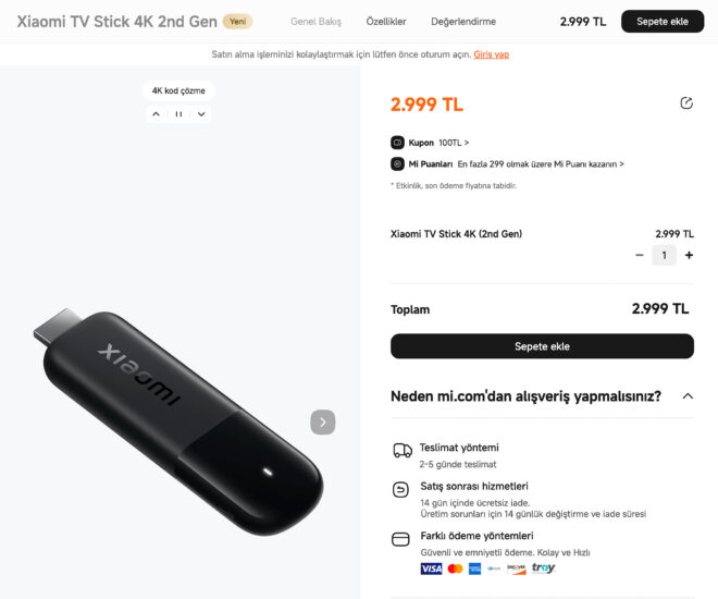 Resmi Türkiye fiyatı 2.999 TL olarak açıklanan yeni Xiaomi TV Stick 4K, oldukça kompakt bir seçenek ve televizyonların yanı sıra monitörler ve projektörlerle de kullanılabiliyor. İsminin de işaret ettiği üzere 4K çözünürlükte görüntü oynatabilen model, Dolby Vision ve HDR10+ desteğine sahip. Aynı zamanda Dolby Atmos ve DTS:X destekleri de sunulan cihaz, gücünü 6 nm tabanlı dört çekirdekli bir işlemciden alıyor. Çift bant Wi-Fi 6 ile yüksek kablosuz bağlantı performansı sağlayabilen yeni TV Stick’in temelinde, çok sayıda uygulamanın bulunduğu Google TV platformu yer alıyor. “Hey Google” sesli komutuna destek veren modelle birlikte, sesli komutları alabilen küçük bir Bluetooth kumanda geliyor. Bu arada Xiaomi’nin resmi sitesine eklenen yeni ürünler arasında 3.499 TL’lik Xiaomi TV Box S 3rd Gen de yer alıyor.