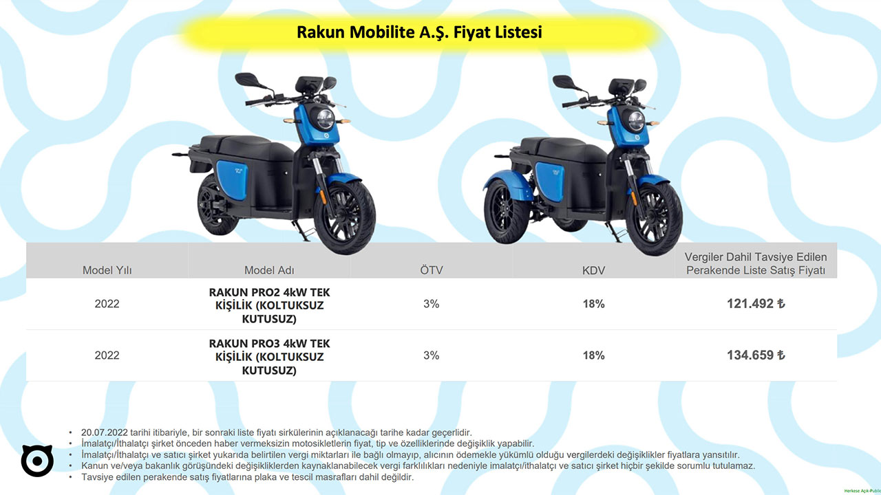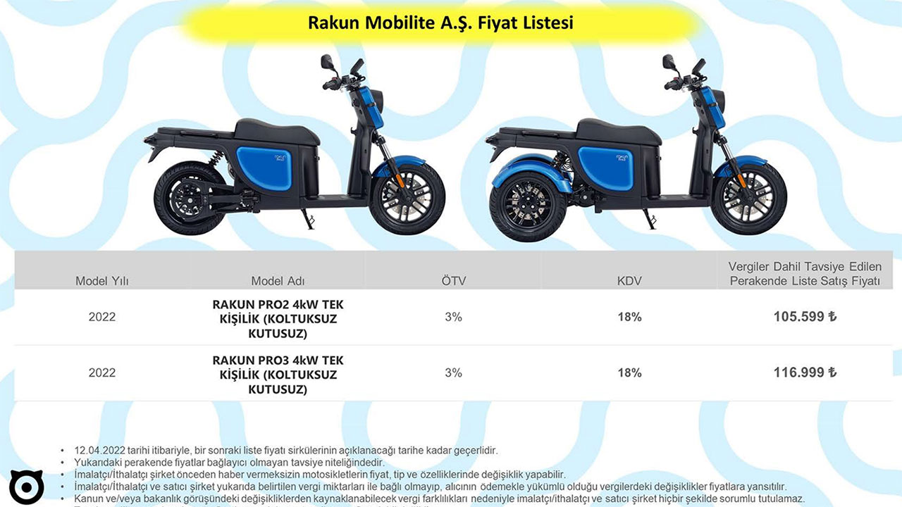 Ford Otosan şirketi Rakun Mobilite tarafından üretilen yerli elektrikli motosiklet modellerinin ilk fiyatları Rakun Pro 2 için 105.599 TL, Rakun Pro 3 içinse 116.999 TL seviyesindeydi. Bu çok yüksek bulunan rakamlar daha sonra Pro 2 için 106.199 TL, Pro 3 içinse 117.699 TL seviyesine çekildi. 19 Haziran itibarıyla Pro 2 modeli için 114.699 TL, Pro 3 içinse 127.000 TL verilmesi gerekiyordu. 21 Temmuz itibarıyla artan fiyatlar “kutusuz ve tek kişilik” olarak Rakun Pro 2 modeli özelinde 121.492 TL, Rakun Pro 3 özelinde ise tam 134.659 TL oldu. Firma bu yüksek fiyatların içerisinde yüzde 18 KDV, yüzde 3 ise ÖTV olduğunu aktarıyor. Üzerlerinden geçmek adına Rakun Pro 2 modeli ile ortalama 100 km menzil elde edilebiliyor. Bu menzil yol şartlarına ve sürücü ile yük ağırlığına bağlı olarak değişiyor. Örneğin sürekli yokuşlu yollarda menzil daha düşük oluyor.