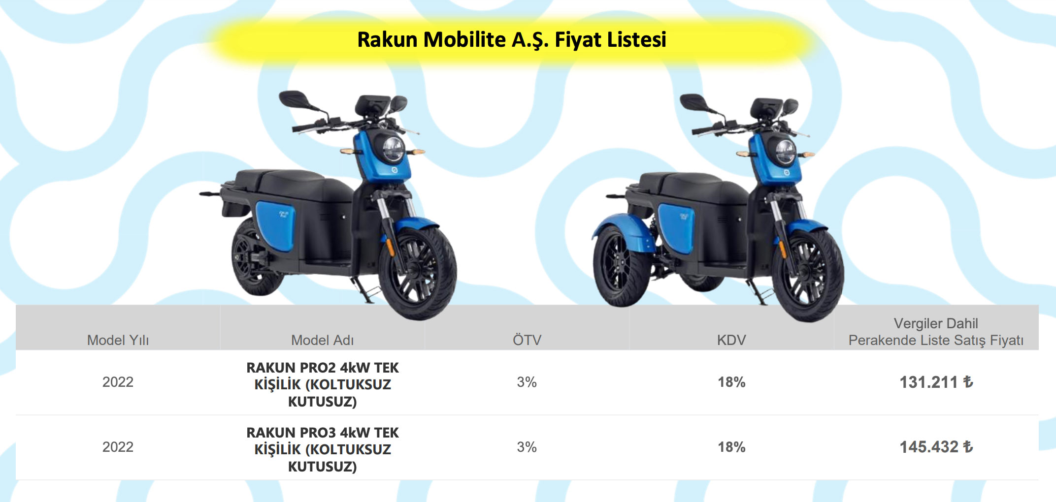 Ford Otosan şirketi Rakun Mobilite tarafından üretilen yerli elektrikli motosiklet modellerinin ilk fiyatları Rakun Pro 2 için 105.599 TL, Rakun Pro 3 içinse 116.999 TL seviyesindeydi. Bu rakamlar daha sonra Pro 2 için 106.199 TL, Pro 3 içinse 117.699 TL seviyesine çekildi. 19 Haziran itibarıyla Pro 2 modeli için 114.699 TL, Pro 3 içinse 127.000 TL verilmesi gerekiyordu. 21 Temmuz itibarıyla “kutusuz ve tek kişilik” Rakun Pro 121.492 TL, Rakun Pro 3 ise 134.659 TL olmuştu.