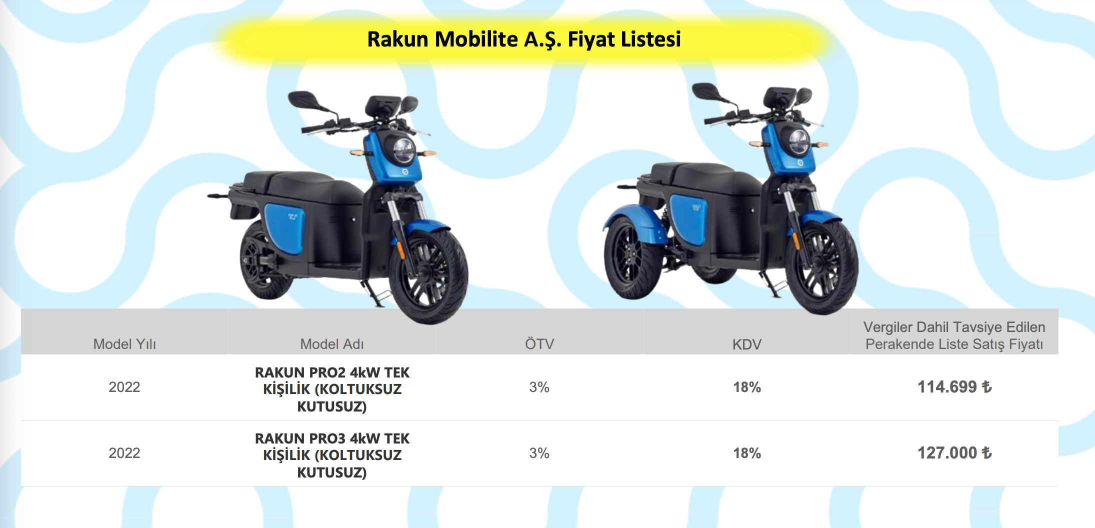 Ford Otosan şirketi Rakun Mobilite tarafından üretilen yerli elektrikli motosiklet modellerinin ilk fiyatları Rakun Pro 2 için 105.599 TL, Rakun Pro 3 içinse 116.999 TL seviyesindeydi. Bu çok yüksek bulunan rakamlar daha sonra Pro 2 için 106.199 TL, Pro 3 içinse 117.699 TL seviyesine çekildi. 19 Haziran itibarıyla ise Pro 2 modeli için 114.699 TL, Pro 3 içinse tam 127.000 TL verilmesi gerekiyor. Firma bu yüksek fiyatların içerisinde yüzde 18 KDV, yüzde 3 ise ÖTV olduğunu aktarıyor. Üzerlerinden geçmek adına Rakun Pro 2 modeli ile ortalama 100 km menzil elde edilebiliyor. Bu menzil yol şartlarına ve sürücü ile yük ağırlığına bağlı olarak değişiyor. Örneğin sürekli yokuşlu yollarda menzil daha düşük oluyor.
