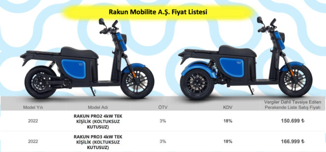 Bugün yani 8 Aralık itibarıyla gelen yeni zam sonrasında ise “tek kişilik, koltuksuz ve kutusuz” 4 kW Rakun Pro 2 modeli 151 bin TL, “tek kişilik, koltuksuz ve kutusuz” 4 kW Rakun Pro 3 ise tam 167 bin TL oldu. Firma bu gerçekten çok yüksek fiyatların içerisinde yüzde 18 KDV, yüzde 3 ise ÖTV olduğunu aktarıyor.
