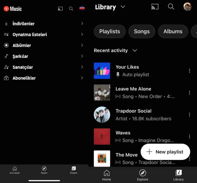 YouTube Music, Apple Music ve Spotify kadar kullanıcı sayısına sahip değil ancak yine de çok büyük bir kitle tarafından aktif olarak kullanılıyor. Özellikle YouTube Premium içerisine dahil olmasıyla dikkat çeken platform, uzun zamandır atıl durumda kalan “Kitaplık” bölümündeki tasarımı değiştiriyor. Yakında herkes için aktif edilecek yeni tasarımda eskiden farklı olarak sadece yazılı kategoriler karşımıza çıkmayacak. Firma yeni “Kitaplık” tasarımında direkt olarak sizinle bağlantılı içerikleri / şarkıları gösteriyor, kategorileri (Çalma Listeleri, Şarkılar, Albümler ve Sanatçılar) yukarıya taşıyor. Bu sayfaya bir “karışık çal” butonu ekleyen Google, yeni tasarımda “Kitaplık” butonu üzerinden “Kitaplık, İndirilenler, Yüklenenler ve Cihaz Dosyaları” arasında hızlı geçiş imkânı da tanıyor.
