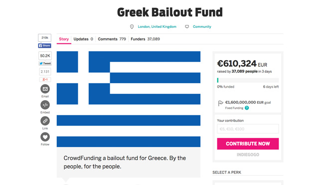 Kulağa garip gelse de aslında durum tam olarak böyle. Hatta daha önce Kickstarter‘da patates salatası için bağış toplandığına şahit olmuş kullanıcılar için bu durum mantıklı bile gelebilir. Ünlü fon toplama sitesi Indiegogo’da Yunanistan’ın yaşadığı ekonomik çöküntü için “finansal krizden kurtarma paketi” projesi açılmış durumda. İşin ilginç yanı bu kampanyayı başlatan kişinin bir Yunan değil, bir İngiliz olması.