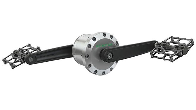 Yukarıda gördüğünüz pedala sahip ana ünite, kişi pedal çevirdiği zaman oluşan mekanik enerjiyi elektrik enerjisine dönüştürüyor ve bunu elektriksel kablo ağı üzerinden arkadaki 250W gücündeki elektrik motoruna aktarıyor. Bu motor ise elektrik enerjisini mekanik enerjiye dönüştürerek bisikletin hareket etmesini sağlıyor.